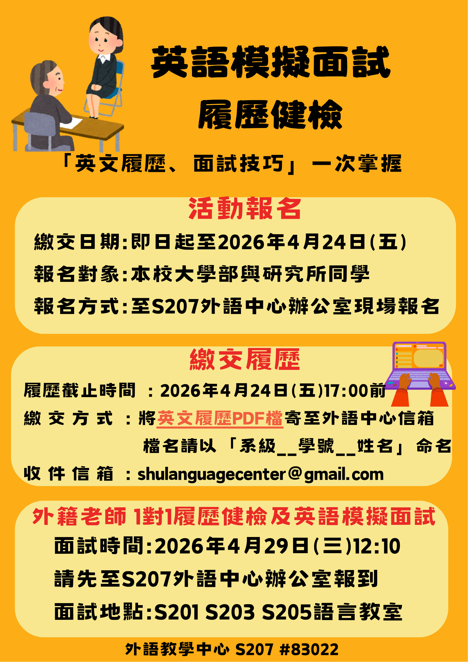 面試時間:2026/04/29 (三) 12:10-15:00 (請先至S207外語中心辦公室報到)